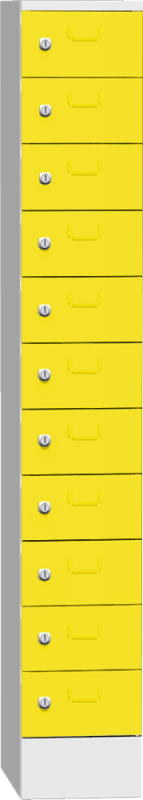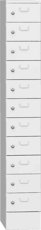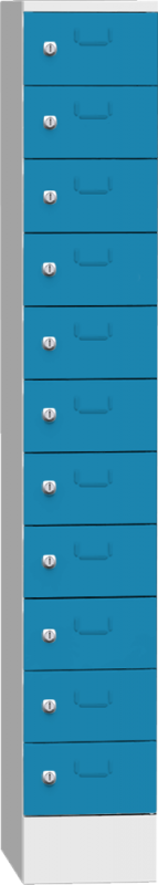 Skrinka s boxmi/priehradkami na triedenie pošty - 11 priehradiek Jedenásť schránok s vlastným jednobodovým cylindrickým zámkom. pre využitie v kanceláriách.Každý box je vybavený dvierkami z 1 mm oceľového plechu. Dvere sú zavesené pomocou centrálnej tyče (stĺpec). alebo otočným uzáverom pre visiaci zámok (visací zámok nie je súčasťou dodávky). Cylindrický zámok má 2000 kombinácií a umožňuje dodanie univerzálneho hlavného kľúča. Skriňu je možné vybaviť šikmou strechou, tá zabraňuje odkladaniu odpadkov na strechu skrine a uľahčuje jej čistenie. vloženie menovky.